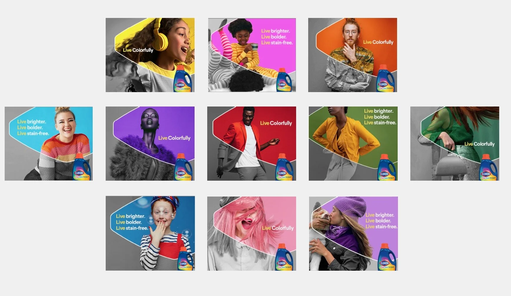 And so was Clorox. The political and cultural (COVID) climate was all about clean. But also about the small wins. It gave us permission to be editorial, aspirational and fashion-forward. And inspire people to live colorfully. Most people associated Clorox with bleach. So the campaign brought a freshness to the familiar Clorox logo. Showing that color - and how you live it - is more beautiful, more vibrant, more protected in our world.